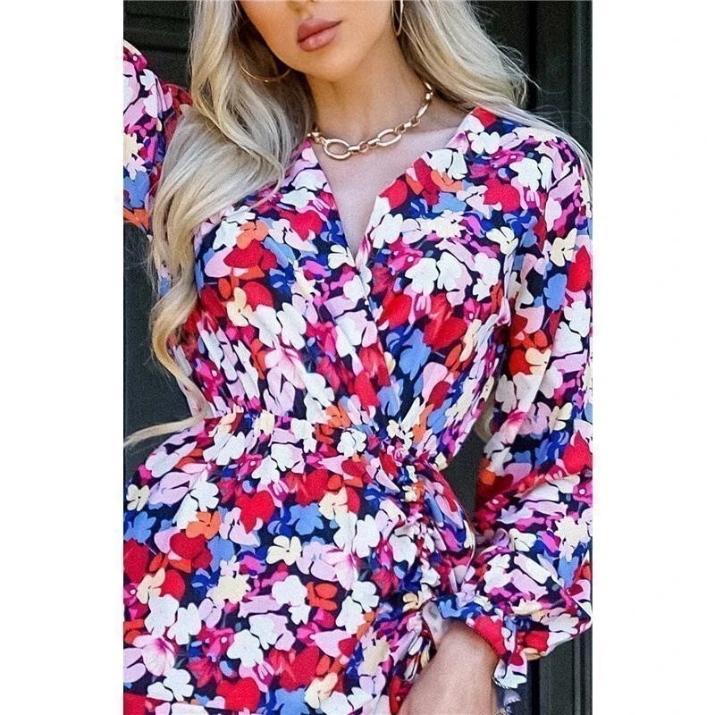 - Kurzes Damen-Sommerkleid in Wickeloptik mit Blumenmuster und Volant-Stufen