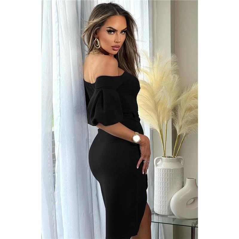 - Elegantes schulterfreies Damen Midi-Kleid in Wickel-Optik aus festem Stretchstoff